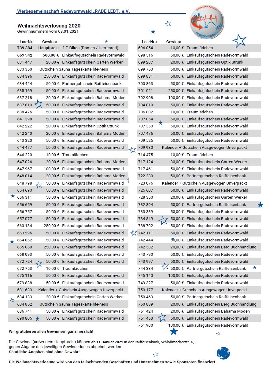 Die Gewinnlisten dürfen gerne geteilt werden, da das Verteilen über die Einzelhändler in diesem Jahr leider nicht möglich ist.